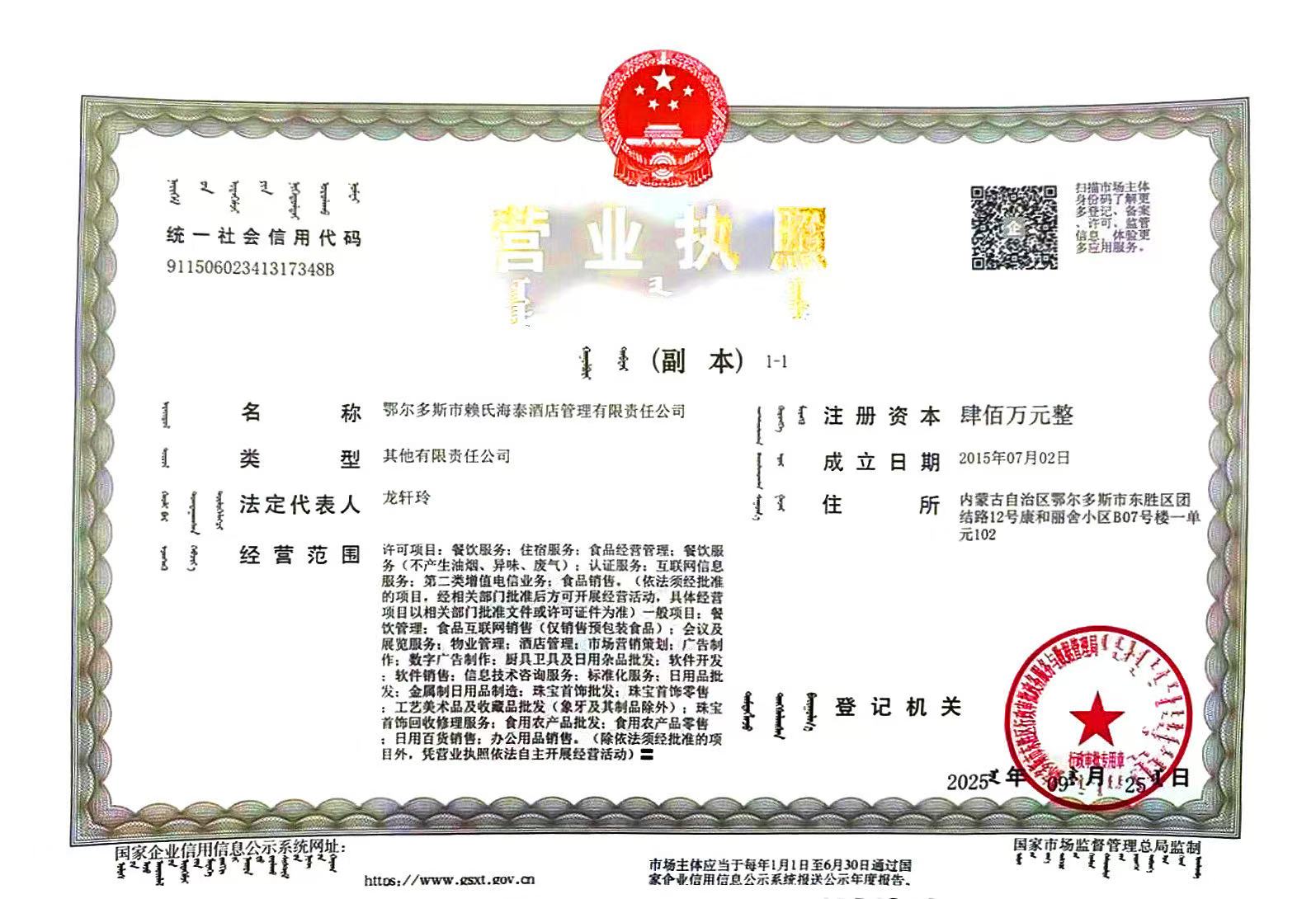 鄂尔多斯市赖氏海泰酒店管理有限责任公司